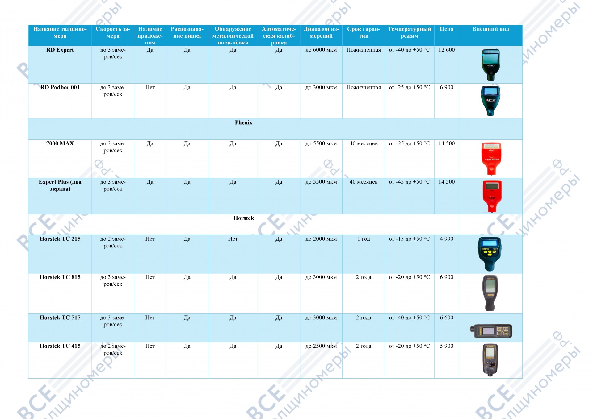 В последнее время нашим специалистам поступает много вопросов касательно различий толщиномеров по тем или иным характеристикам. Тем более сейчас появилось много новых моделей, таких как RDevice Podbor 001, RDevice Expert, Horstek TC 915 Elite.